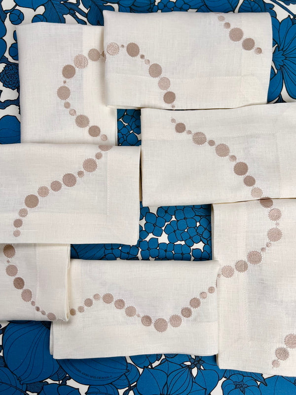 Le Collier is embroidered with a vintage pearl necklace that winds its way across the cloth in an unhurried, organic line. Every stitch is worked by hand by our all-female team of seamstresses in Ukraine